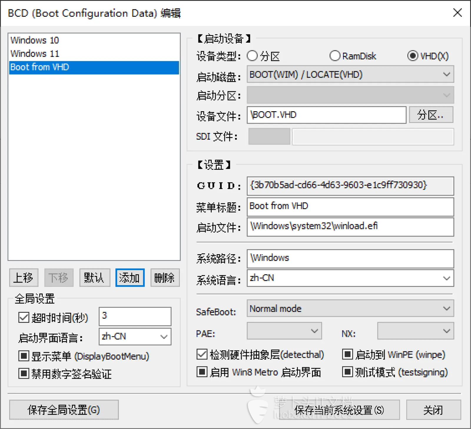 2.找到WTG的vhd引导项,启动磁盘、设备文件这两处的内容组合起来就是vhd文件所在的路径;